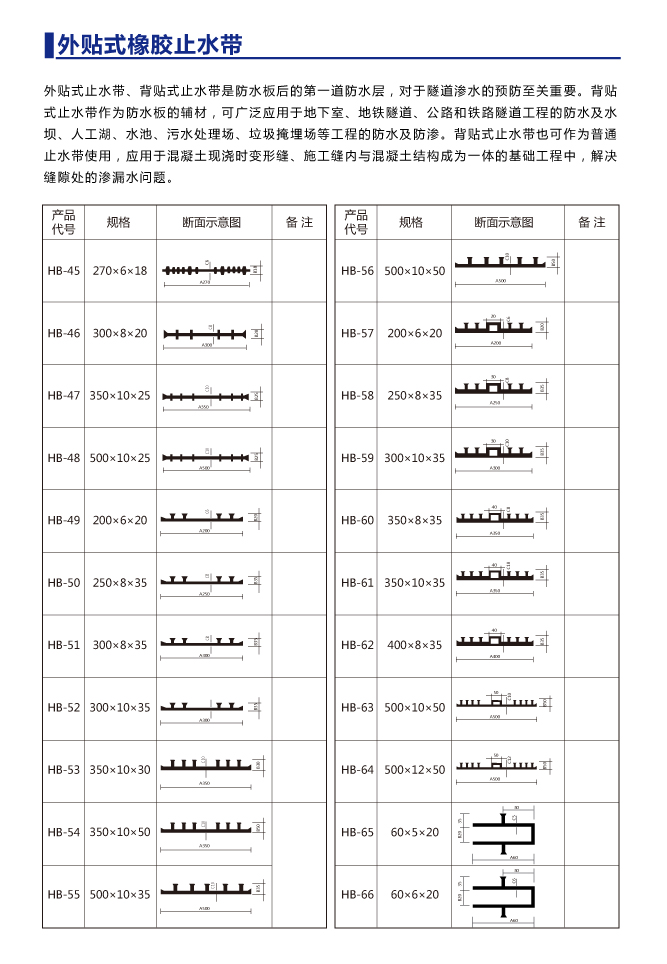 外貼式橡膠止水帶以天然橡膠與各種合成橡膠為主要原料,摻加各種助劑及填充料,經(jīng)塑煉、混煉、壓制成型,其品種規(guī)格較多,有橋型、山型、P型、U型、Z型、乙型、T型、H型、E型、Q型等。外貼式橡膠止水帶根據(jù)使用情況又可分類為中埋式橡膠止水帶和外貼式橡膠止水帶。該止水材料具有良好的彈性,耐磨性、耐老化性和抗撕裂性能,適應(yīng)變形能力強、防水性能好,溫度使用范圍為-45℃-+60℃。當溫度超過70℃,以及橡膠止水帶受強烈的氧化作用或受油類等有機溶劑侵蝕時,均不得使用橡膠止水帶。